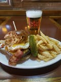 Seasoned burger with bacon, Cheddar, onion ring and bbq sauce.